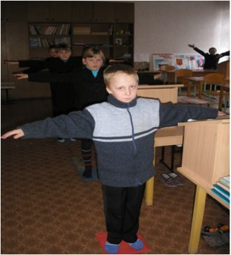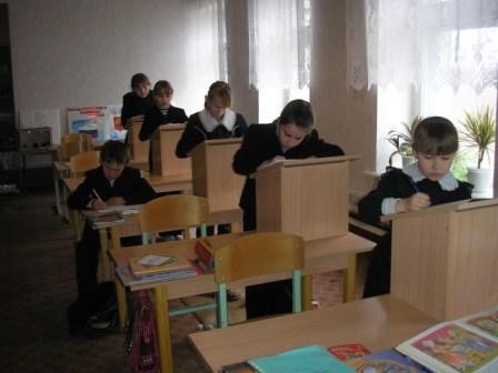 Часть урока ученики сидят за партой, другую часть - стоят за конторками. Тем самым сохраняется и укрепляется позвоночник, формируется правильная осанка.