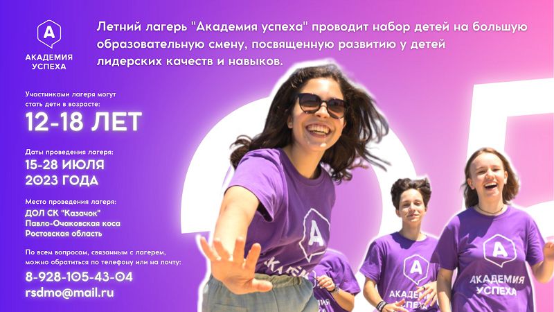 Ростовский Союз детских и молодежных организаций при поддержке регионального ресурсного центра проекта «Навигаторы детства» проводит с 15 по 28 июля 2023 года молодежную школу лидерства «Академия успеха» для школьников возрасте 12-18 лет (активисты детских общественных объединений и школьного самоуправления).