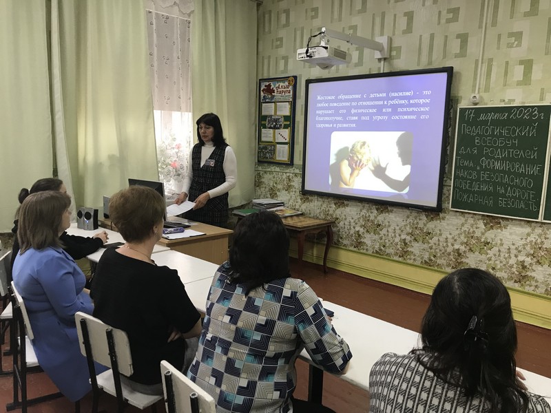 По первому вопросу о комплексной безопасности ребенка в быту и социуме «Формирование навыков безопасного поведения на дороге. Безопасность ребенка в быту. Пожарная безопасность. Безопасность детей на водных объектах» выступила учитель математики Ливанда Е.В. с вручением памяток. Она рассказала о работе классных руководителей в данном направлении и показала следующие документы: журнал инструктажей с росписями обучающихся и родителей, вручение памяток по основам безопасности жизнедеятельности лично детям под роспись и отправка родителям по WhatsApp. А так же обсудили вопросы ответственности родителей за жизнь и здоровье детей, соблюдения комплексной безопасности: на дороге, водоемах, при неблагоприятных погодных условиях, пожарной безопасности в быту и общественных местах в период весенних каникул. Учитель информатики и физики Дудинов И.И. подготовил тему «Информационная безопасность ребенка в сети Интернет» с проведением онлайн-урока для родителей. О профилактике насилия и жестокого обращения с детьми рассказала с показом презентации и дала рекомендации общественный инспектор по охране прав детства и школьный уполномоченный по правам ребенка Самсонова Н.А. После педагогического всеобуча состоялись родительские собрания по классам с повесткой дня «Итоги успеваемости 3 четверти 2022-2023 уч. года»