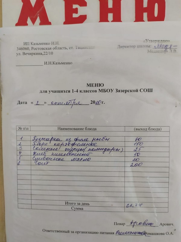 Меню ежедневного горячего питания