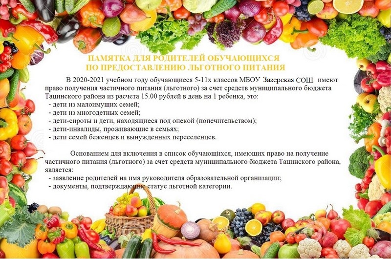 В соответствии со ст. 37 Федерального закона от 29.12.2012 № 273-ФЗ "Об образовании в Российской Федерации", Постановлением Главного государственного санитарного врача Российской Федерации от 27.20.2020 № 32 "Об утверждении санитарно-эпидемиологических правил и норм СанПиН 2.3/2.4.3590-20 "Санитарно-эпидемиологические требования к организации общественного питания населения" и с целью организации полноценного питания школьников, обеспечивающего охрану и укрепление их здоровья, в МБОУ Зазерская СОШ организовано: