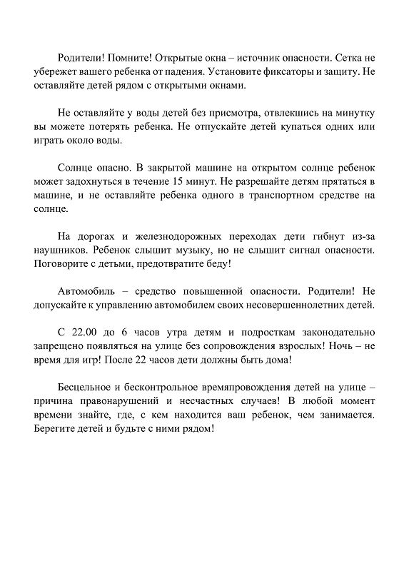 Летом, с началом каникул, наших детей подстерегает повышенная опасность на дорогах, у водоемов, в лесу, на игровых площадках, в саду, во дворах. Этому способствует погода, летние поездки и любопытство детей, наличие свободного времени, а главное отсутствие должного контроля со стороны взрослых. Летом надо помнить ряд правил и условий при организации детского отдыха с родителями, родственниками, друзьями (на даче или в деревне у бабушки).