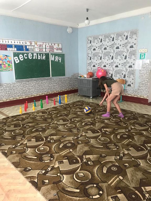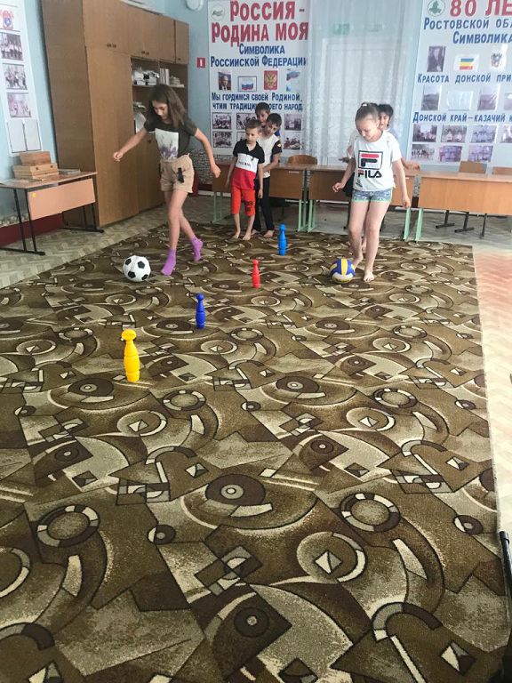 Во второй половине дня дети принимали участие в спортивной передаче «Веселый мяч». Вспомнили: какие мячи бывают, в каких видах спорта используют мяч, героем каких стихотворений стал мяч, узнали историю появления мяча. Затем дети приняли участие в спортивных состязаниях с мячом: сбивали кегли, передавали мяч, используя элементы футбола.
