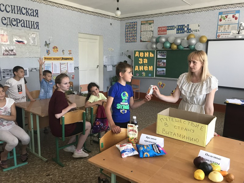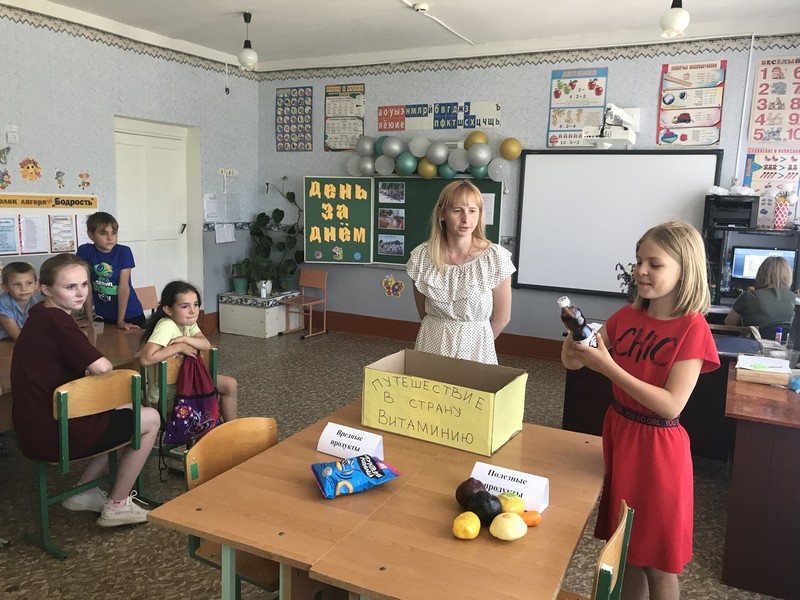 День в пришкольном лагере начался с термометрии детей, утренней зарядки и подвижных игр на свежем воздухе. До завтрака Исаева И.В. провела минутку здоровья на тему «Путешествие в страну Витаминию», рассказала о здоровом образе жизни, правилах питания и пользе витаминов для здоровья человека. Ребята закрепили знания о полезных продуктах, расширили свои знания о содержании витаминов в овощах и фруктах. В интересной форме прошла викторина «Отсортировка полезных и вредных продуктов».