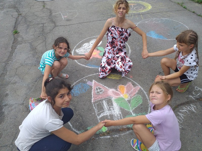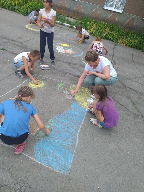 Воспитатель Реентова Л.М. провела конкурс рисунков на асфальте «Дом , в котором я живу». Разноцветные мелки украсили вход в школу. Рисунки выразили фантазию и мечты наших детей.
