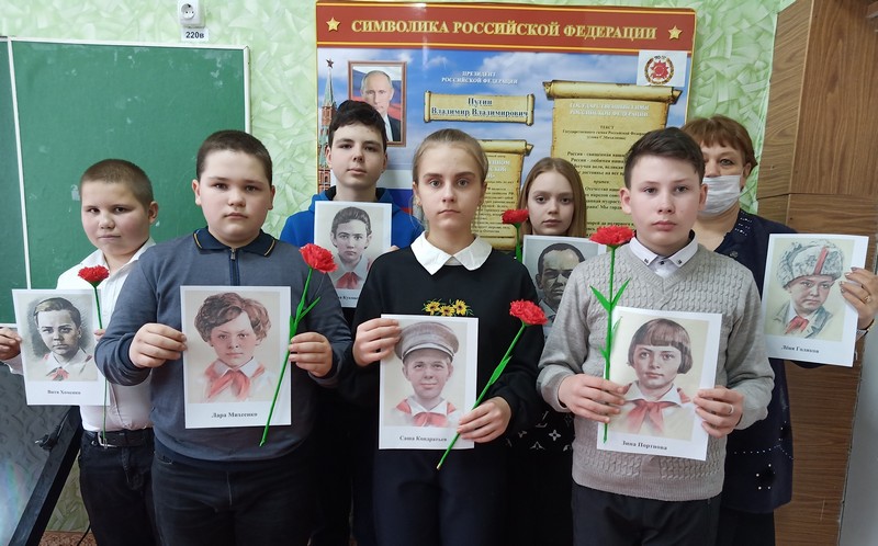 Вот уже более 58 лет 8 февраля отмечается День памяти всех детей, которые наравне со взрослыми сражались в годы Великой Отечественной войны. Это пионеры-герои: Леня Голиков, Зина Портнова, Валя Котик, Марат Казей и многие другие, чьи имена навечно вписаны в историю нашей Родины, среди них и наши земляки – Гриша Волков и Федя Игнатенко. Минутой молчания почтили школьники память юных героев погибших за счастье и свободу Родины. Сегодня мы учимся у них беззаветной любви к Родине, смелости и достоинству, мужеству и стойкости. Над нами мирное небо. И пусть каждый задаст себе вопрос: «А я смог бы поступить так?» - и, ответив самому себе искренне и честно, подумает, как надо сегодня жить и учиться, чтобы быть достойным памяти своих замечательных ровесников, юных граждан нашей страны.