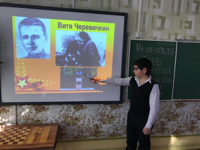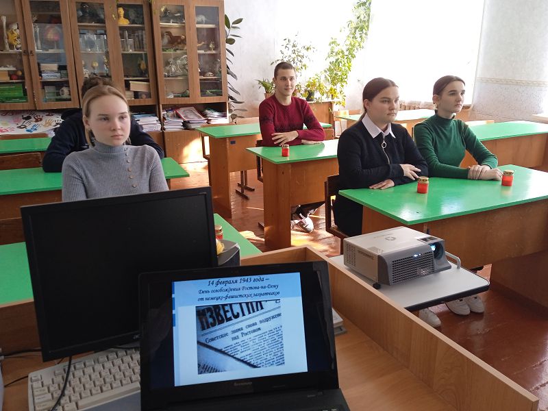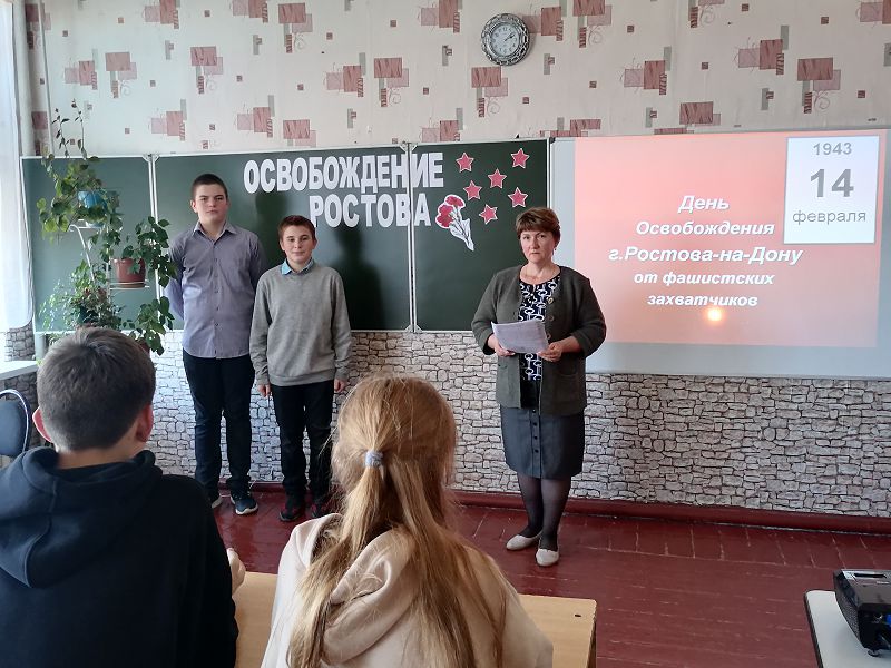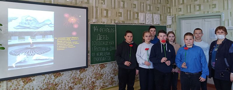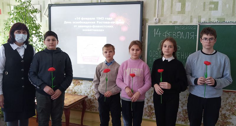 14.02.2022 г. в нашей школе проведены классные часы, посвященные 79-й годовщине освобождения г. Ростова-на Дону от немецко-фашистских захватчиков. Ребята посмотрели презентации и почтили минутой молчания героев, погибших за освобождение города Ростова.