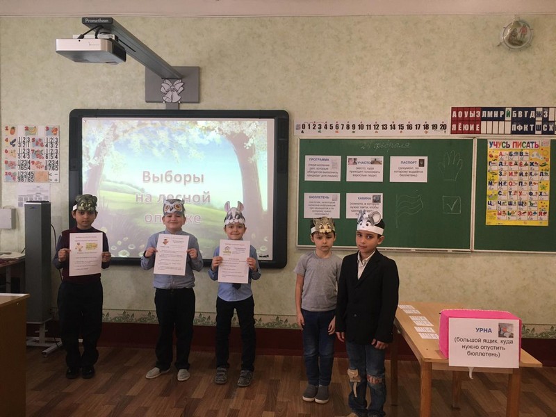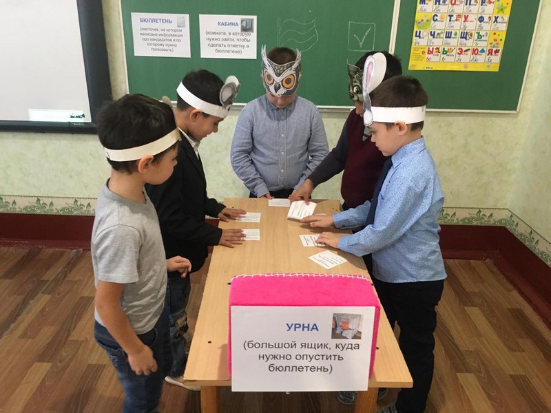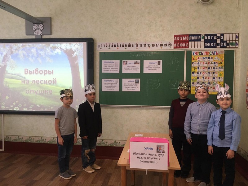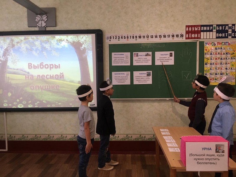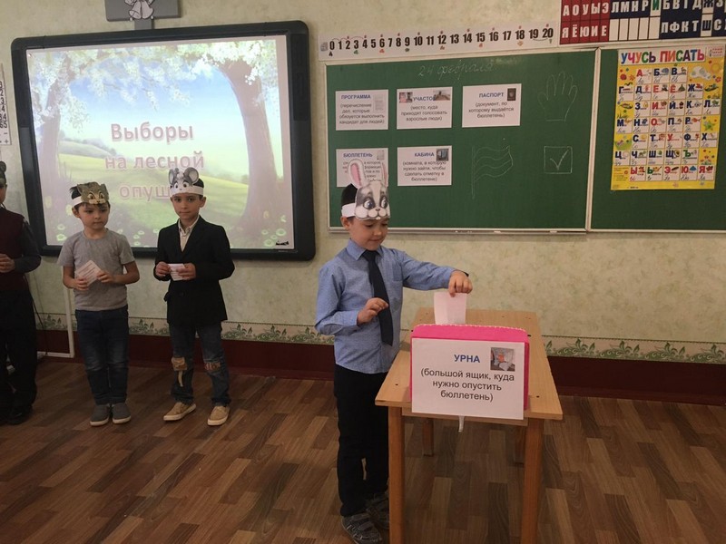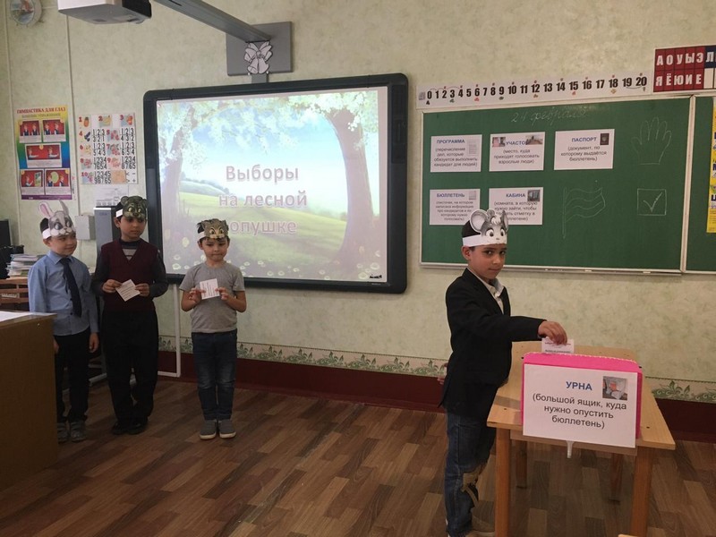 - Классный час для учащихся 1 класса на тему «Что такое выборы?», где ученики познакомились с понятиями: участок, бюллетень, кабина, урна, паспорт, программа. Дети узнали о том, с какой целью проводятся выборы, кто участвует в выборах, почему необходимо голосовать всем гражданам? В конце мероприятия малыши приняли участие в деловой игре «Выборы на лесной опушке».