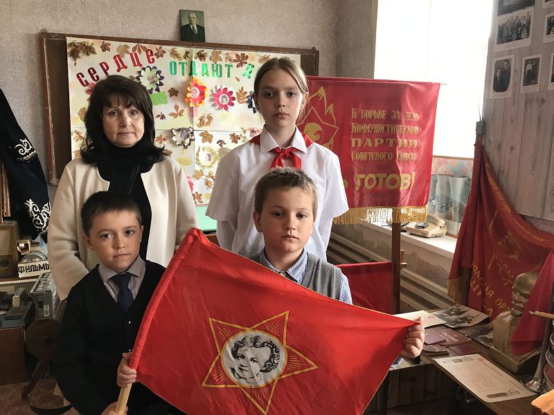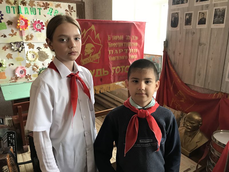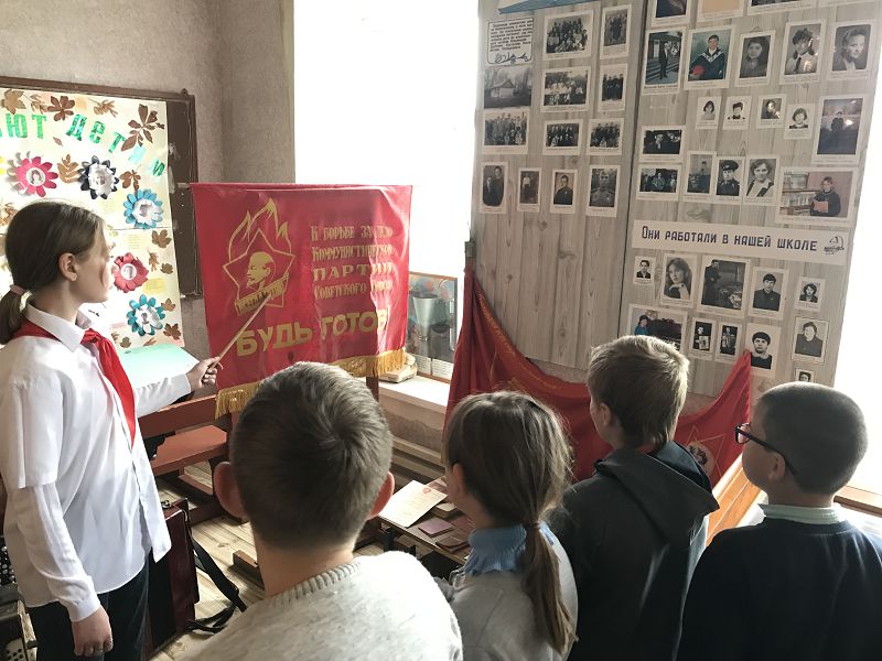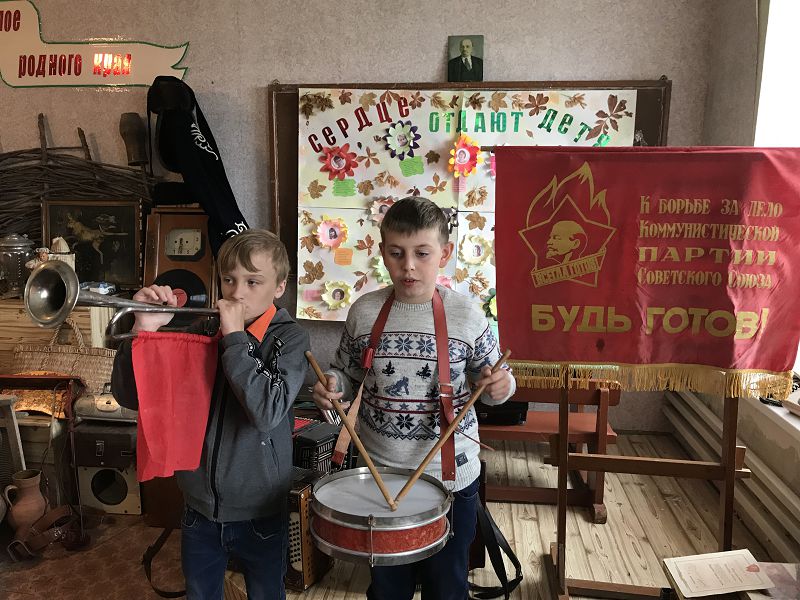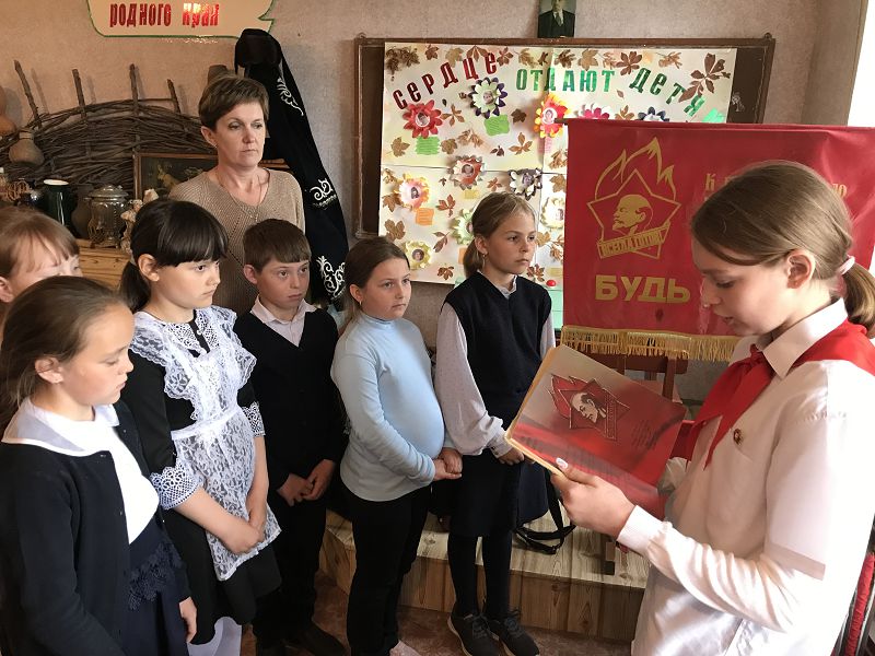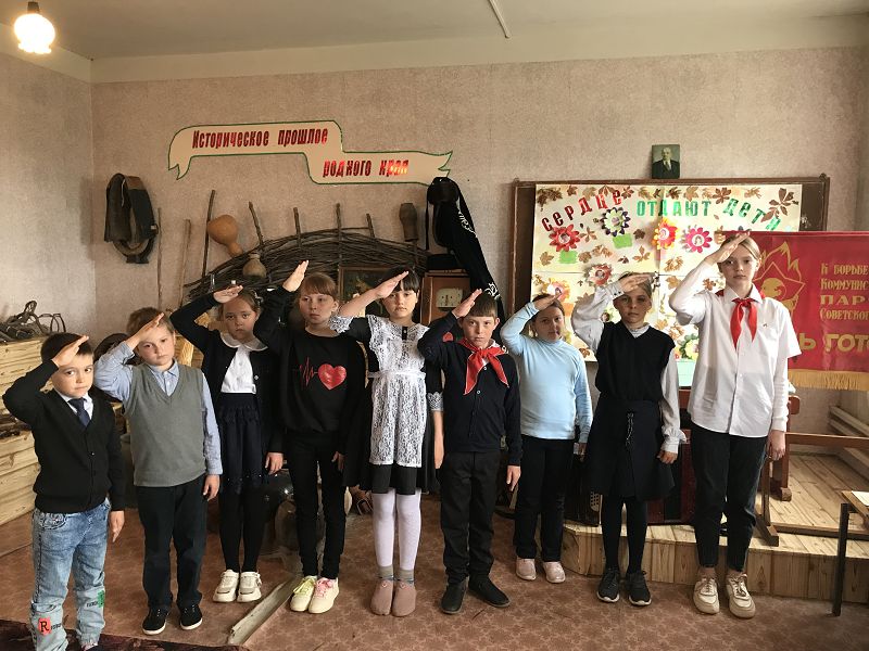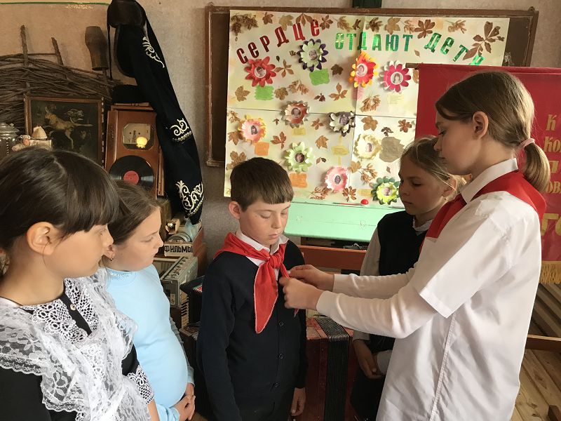 Экскурсовод Гелемеева Зоя ученица 7 класса рассказала ребятам об истории создания пионерской организации, законах пионерской жизни, пионерском сборе, который начинался с сигнала горниста и барабанщика, значении трех концов пионерского галстука – «Связь трех поколений: пионеров, комсомольцев и коммунистов». Ребята попробовали завязать галстук, как делали это пионеры в прошлом, пройтись с горном и барабаном в почетном строю со знаменем, произнесли клятву пионеров и на призыв «Будь готов! ответили «Всегда готов!», отдав пионерский салют. Главные качества пионера, которые актуальны и сегодня, быть честным, дружным, трудолюбивым, хорошо учиться, выполнять порученное дело, помогать взрослым и любить свою Родину.