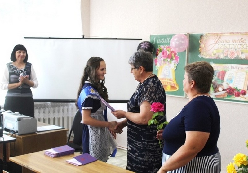 Она пожелала им идти по жизни добрыми, честными, трудолюбивыми, справедливыми и отзывчивыми, умения преодолевать трудности, верить в себя и идти к намеченной цели. Аттестаты об основном общем образовании выпускникам вручила директор школы Медведева Л.В., она поблагодарила их за успешную сдачу экзаменов, пожелала детям и родителям доброго пути во взрослую жизнь. На хорошо и отлично сдали выпускные экзамены Реентов Захар, Мойсюк Анастасия и Маликова Алена. Классный руководитель Морозова Н.А. поздравила своих выпускников с получением аттестатов зрелости и вручила им цветы. На последнем уроке выпускники и родители посмотрели презентацию «Школьные годы чудесные», провели викторину «Хорошо ли я знаю школу?», вспомнили свою школьную жизнь и беззаботное детство. Ребята поблагодарили своих учителей за знания, которые они им дали, пожелали всем здоровья, успехов в обучении и воспитании обучающихся.