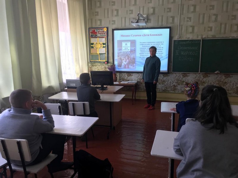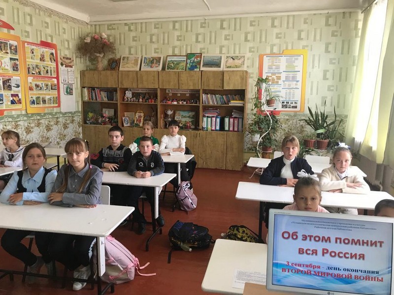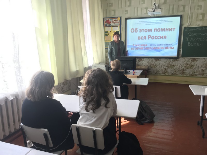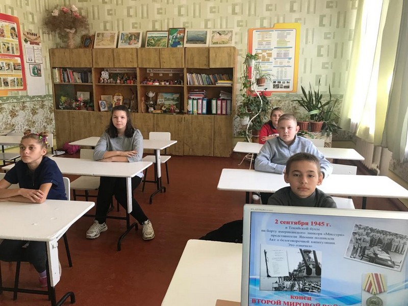 С целью сохранения памяти о погибших и выживших, солдатах, офицерах и всех участниках тех событий, на слайдах презентаций дети познакомились с произведениями русских писателей о детях войны, выставкой картинок, которая посвящена последней точке Второй мировой войны: капитуляции и падении Японии. Учитель истории Высочева Л.Е. поведала учащимся на уроках истории о том, что именно в этот день был побежден нацизм и фашизм, прекращено преступление против всего человечества. Ключевую роль в этой Победе сыграл Советский Союз и его храбрые воины: они сражались не только за свою Родину. Советские солдаты гнали врага до самого Берлина, изгоняя его с территорий других государств, захваченных нацистской Германией и ее союзниками. Мы должны помнить и чтить подвиг наших предков и их вклад в мирную жизнь современных государств. С каждым днём их остаётся всё меньше, их, живых свидетелей героических сражений. В нашей стране по Указу президента Российской Федерации этот праздник отмечается с 2010 года. Вторая мировая война была самой тяжелой и кровавой войной в истории человечества. Во время войны погибло не менее 60 миллионов человек, около 27 миллионов граждан Советского Союза и 6 миллионов граждан Польши. Десятки миллионов людей были ранены, стали инвалидами. Война опустошила целые страны, обратила в развалины города и села, превратила в беженцев миллионы людей. 2 сентября 1945 года в 4 часа 2 минуты утра по московскому времени был подписан Акт о капитуляции Японии, положивший конец Второй мировой войне. Учащиеся рассказали о своих прадедушках и прабабушках, которые воевали в годы войны. Вниманию ребят была предложена презентация «Мы потомки победителей, знаем, помним, чтим!».