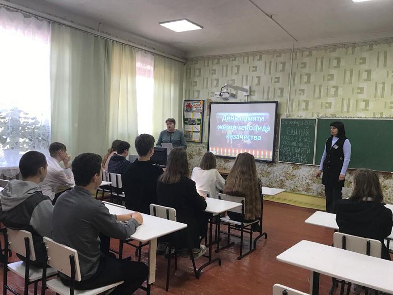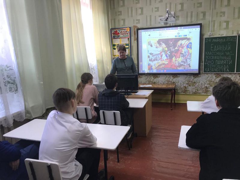 В рамках месячника оборонно-массовой и патриотической работы 24 января для обучающихся школы проведен Единый классный час посвященный Дню памяти жертв геноцида казачества. Данное мероприятие было организованно с целью воспитания интереса к прошлому своих предков, гордости за свой народ. Ребята узнали, что геноцид был закреплён и одобрен директивой ВЦИК от 24 января 1919 года «Об истреблении казачества».