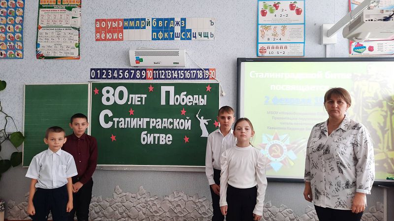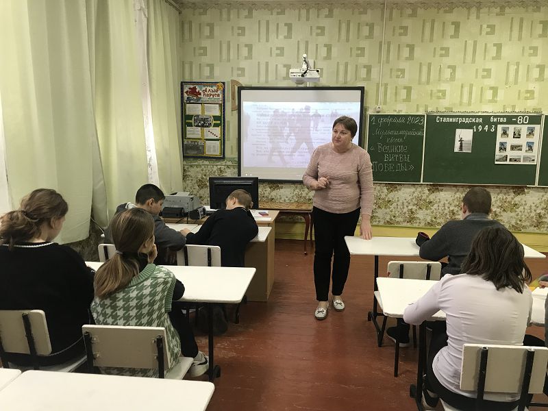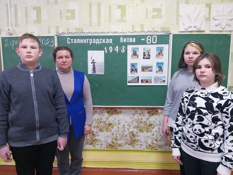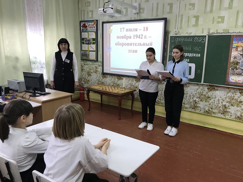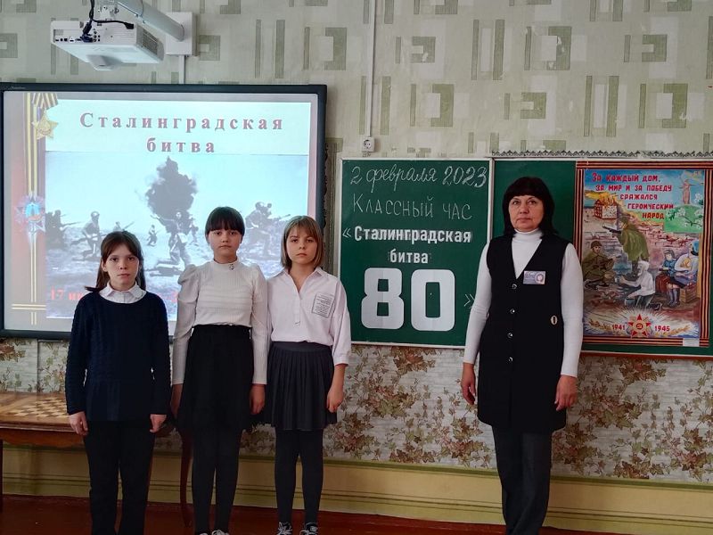 1-2 февраля 2023 г. в нашей школе с обучающимися 1- 11 классов проведены классные часы, уроки мужества, посвященные 80-летию Сталинградской битвы. В начальных классах классные руководители показали детям презентации о Сталинградской битве и ее героях.