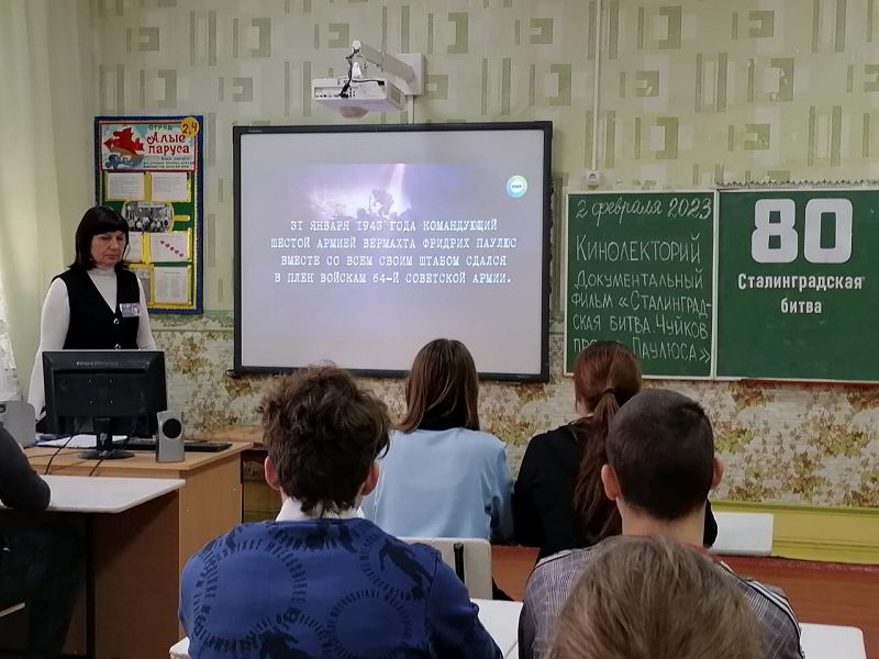 В рамках Федерального проекта по патриотическому воспитанию граждан советником директора по воспитанию Самсоновой Н.А. совместно с учителем истории Высочевой Л.Е. проведены с обучающимися 6-8 классов мультимедийный квест «Великие битвы Победы» и кинолекторий с просмотром документального фильма «Сталинградская битва. Чуйков против Паулюса» со старшеклассниками 8-11 классов. После просмотра фильма было проведено обсуждение в форме открытого диалога.