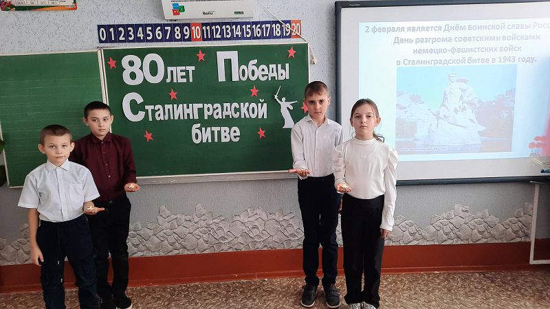 Во 2 и 4 классах мероприятие проведено с волонтерами-организаторами 11 класса Дробязко А. и Мищенко В. Дети почтили минутой молчания всех погибших участников Сталинградской битвы. Низкий им поклон!