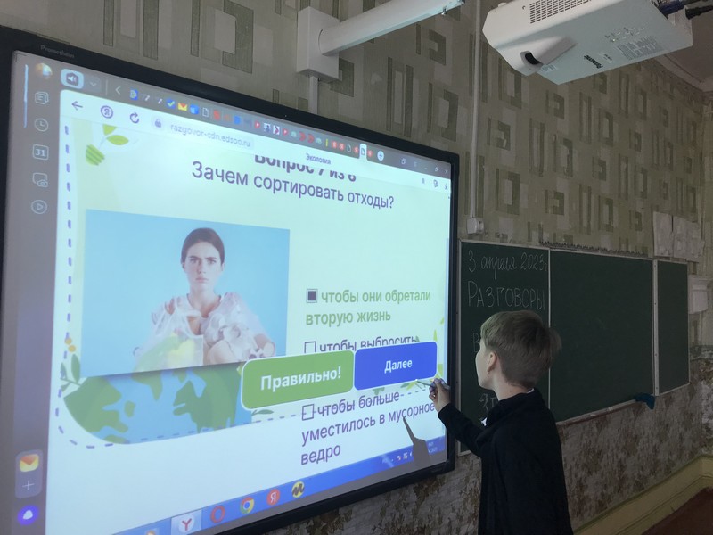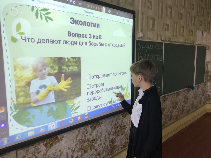 Советник директора по воспитанию Самсонова Н.А. поздравила обучающихся с началом учебной четверти и познакомила с мероприятиями на неделю. С 4 апреля все школьники примут участие в Месячнике чистоты. После линейки состоялись занятия «Разговоры о важном», посвященные Дню Земли. Цели занятий: дать детям первоначальные сведения об экологии, формировать грамотное экологическое поведение, представляющее собой ответственное отношение к окружающему миру, воспитывать бережное отношение к природе и к окружающей среде, расширение знаний обучающихся об экологической проблематике, о достижениях России в отрасли переработки отходов; повышение уровня экологической культуры обучающихся. Классные руководители провели познавательные беседы с использованием видеороликов, презентаций, включающих в себя работу с информацией, выполнение интерактивных заданий.