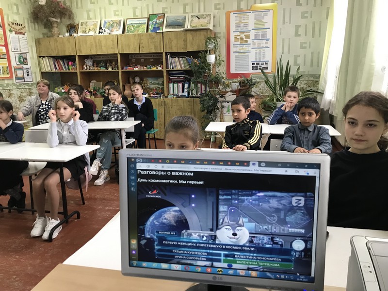 Дежурным классом на неделе объявлен 8 класс под руководством классного руководителя Ливанда Е.В. Советник директора по воспитанию Самсонова Н.А. объявила тему воспитательных мероприятий на предстоящей неделе, которая посвящена Дню космонавтики. 12 апреля 1961 г. советский космонавт Юрий Алексеевич Гагарин впервые совершил полет в космос. Сегодня занятия внеурочной деятельности «Разговоры о важном» посвящены теме «День космонавтики. Мы первые». Дети посмотрели презентации, видеоролики об ученых М.В. Ломоносове, К.Э. Циолковском, С.П. Королеве и первых космонавтах Ю.А.Гагарине, А. А. Леонове, В.В. Терешковой, С.Е. Савицкой и актрисе Ю.С. Пересильд, которая первой снилась в фильме в космосе, ответили на вопросы интерактивной викторины.