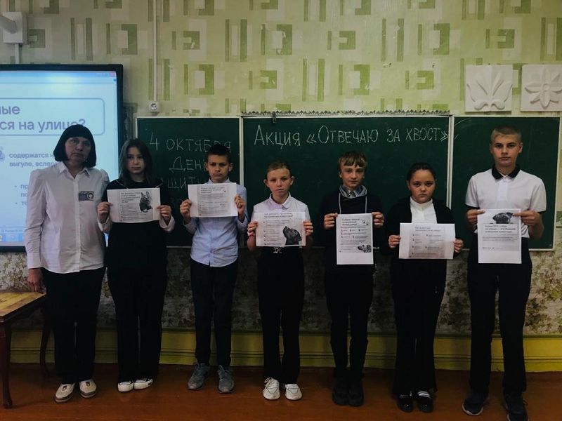 Медвежьи истории» и художественного фильма «Белый Бим – черное ухо» с последующим обсуждением. С обучающимися 6 класса проведена акция «Отвечаю за хвост». Ребята изучили карточки, в которых рассказывается как можно решить проблему безнадзорных животных в России, как им помочь.