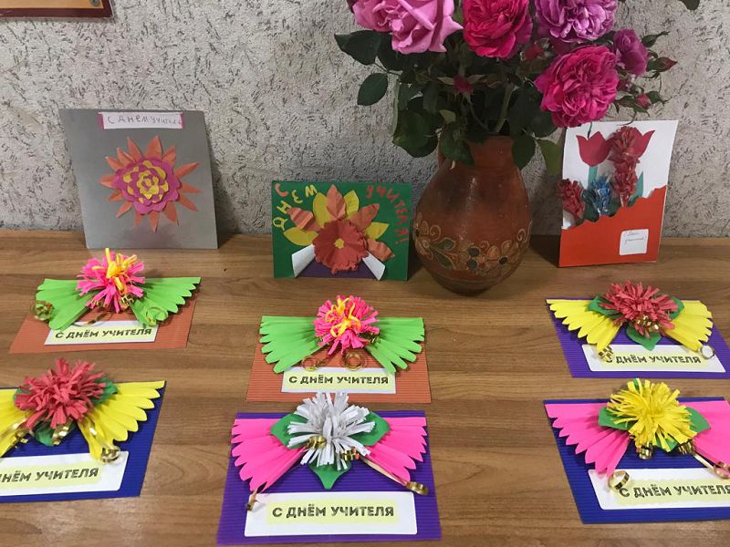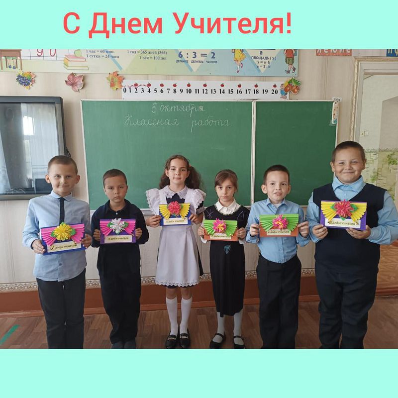 В преддверие Дня учителя в нашей школе проведены конкурсы рисунков и поделок «Планета знаний», изготовление своими руками обучающимися поздравительных открыток. Победителями конкурсов стали Григорьев А. и Текучева Т. (классный руководитель Маркова Н.Г. 3 кл.), коллектив 2 класса (классный руководитель Реентова Л.М.), Пушкарева У., Чернова В. (5 кл.), Шульга К. (4 кл.), второе место заняли Пуш В., Шишова Е., Насыбуллина С. (2 кл.), Пушкарев М. (4 кл.), третье место – Текучев В., Аббубакарова З., Сиволобов Е., Ткачук Г. (2 кл.) Пуш К. (4 кл.).