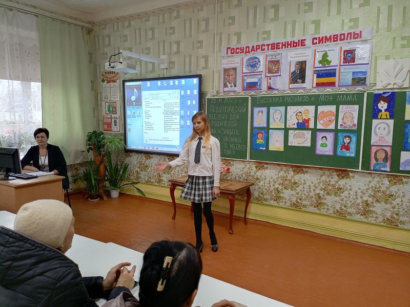 23 ноября 2023 г. в школе состоялся педагогический всеобуч для родителей на тему: «Защита прав и законных интересов несовершеннолетних». В преддверии Дня матери всеобуч был начат учителем начальных классов Реентовой Л.М. с показа презентации по патриотическому воспитанию школьников «День матери-казачки на Дону. Обучающиеся 1-8 классов под руководством классных руководителей подготовили праздничный концерт для мам. Дети пели песни, читали стихи, танцевали и дарили мамам подарки, сделанные своими руками.