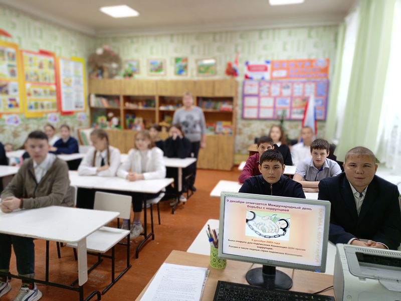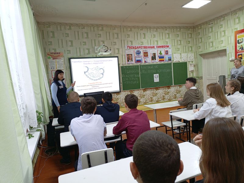 Ежегодно 9 декабря отмечается Международный день борьбы с коррупцией. В рамках этого дня в нашей школе с обучающимися 8-11 классов, 8 декабря 2023 г., проведен классный час на тему: «Мы против коррупции» учителем обществознания Высочевой Л.Е. совместно с советником директора по воспитанию Самсоновой Н.А.. Цель данного мероприятия: просвещение, пропаганда и формирование у обучающихся антикоррупционного мировоззрения.