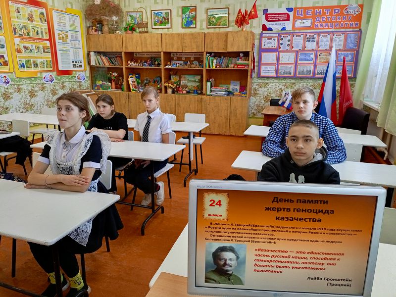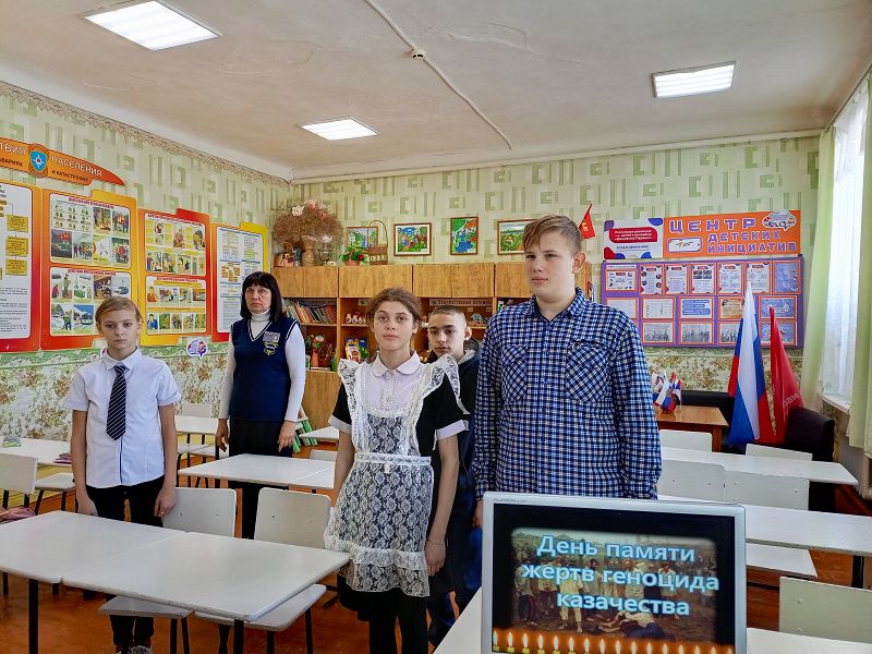 Учитель истории Высочева Л.Е. совместно с советником директора по взаимодействию с детскими общественными объединениями Самсоновой Н.А. рассказали учащимся о геноциде казачества, направленного на тотальное уничтожение этого сословия. Вопрос о реабилитации казачества, сама тема репрессий находились под строжайшим запретом. Лишь в 1991 году, уже после распада СССР, казаки были признаны репрессированными и получили возможность реабилитации. Обучающиеся просмотрели электронную презентацию «24 января - День памяти жертв геноцида казачества» и почтили минутой молчания погибших казаков от репрессий. Из презентации ребята узнали о том, что 24 января 1919 года принята директива Оргбюро РКП(б) о беспощадной борьбе с казаками, участвовавшими в антисоветских выступлениях. 24 января - дата подписания Лениным, Свердловым, Троцким директивы “О расказачивании”. Этот чудовищный документ одним росчерком пера положил начало расказачиванию и жесточайшим репрессиям против бессменного авангарда России с его славным именем, великими делами во славу Отечества и уникальной историей. Пленные казаки с женами и детьми отправлялись в глухие северные губернии. Житницы России - Донская и Кубанская области - подверглись голоду в тяжелой форме.