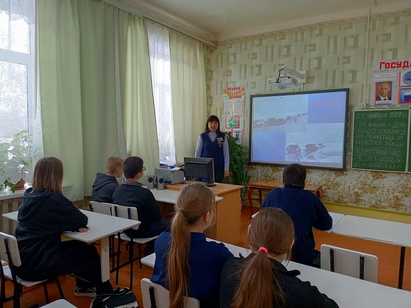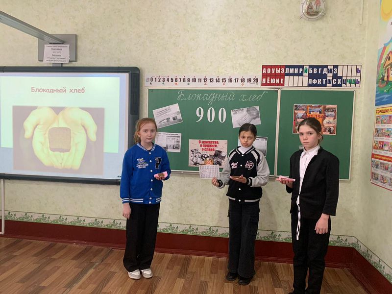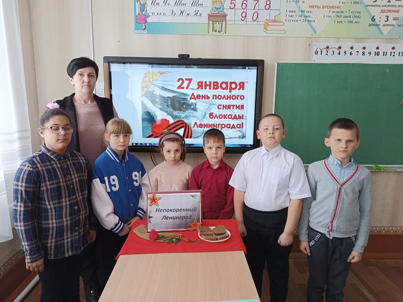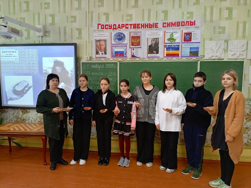 26 января в нашей школе состоялись мероприятия, посвященные 80-летию освобождения Ленинграда от фашистской блокады: классные часы «Блокада Ленинграда», кинолекторий с просмотром кинокартин «Блокада Ленинграда глазами детей», «Крик тишины» с последующим обсуждением; интеллектуальная игра «Важно в памяти сберечь» с обучающимися 9-11 классов, акция «Лента памяти», в которой активное участие приняла ученица 5 класса Чернова Виктория со стихотворением Ольги Берггольц «Ленинградский салют», в акции памяти «Блокадный хлеб», цель которой напоминание о мужестве и стойкости мирных жителей Ленинграда в годы Великой Отечественной войны, приняли обучающиеся 1-11 классов. Школьники узнали, что норма выдачи хлеба в то голодное время была очень маленькой и составляла всего 250 граммов на работающего и 125 граммов на остальных. Маленький кусочек хлеба выпекался из примесей жмыхов, овсяной муки и целлюлозы, получаемой из древесины, в него добавляли хвою и коревую муку. Хлеб был горьковатым на вкус, но именно он был надеждой на жизнь в ту тяжелую военную пору.