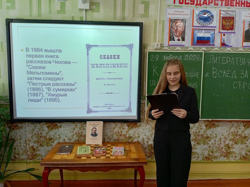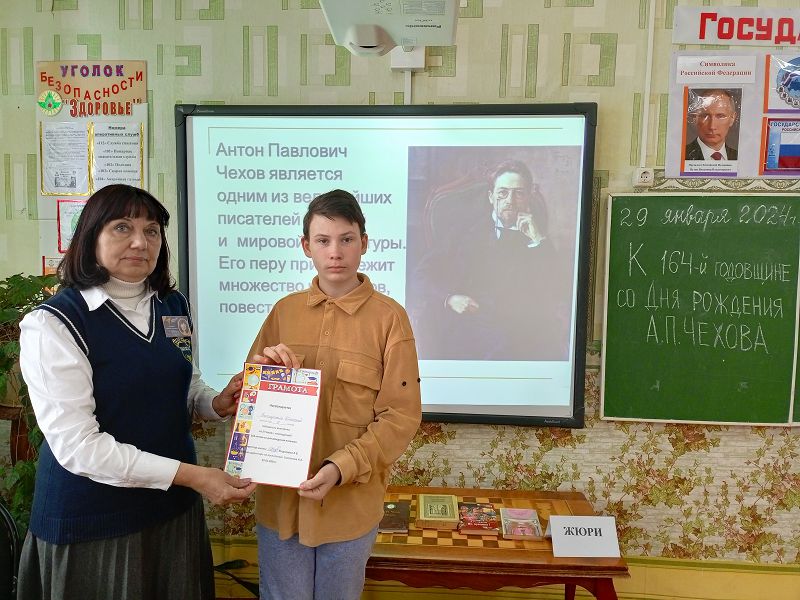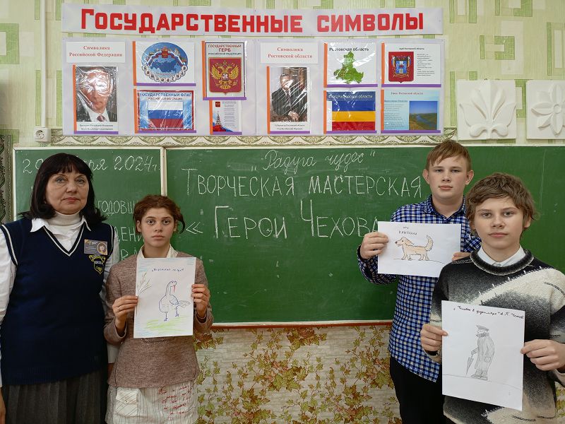 Чехова советником директора по воспитанию и взаимодействию с детскими общественными объединениями Самсоновой Н.А. совместно с учителями русского языка и литературы, библиотекарем Мышанской С.В. организовано участие школьников в онлайн - активности «Читаем Чехова вместе». Участники акции записали видеоролики совместного прочтения произведений А.П. Чехова с педагогами и учениками. Проведены: литературная гостиная «Вслед за чеховской строкой…» для учеников 6 − 11 классов, викторина «А.П. Чехов» для учеников 9 классов, конкурс творческих работ «Герои Чехова» среди обучающихся 7 класса и кинолекторий «По произведениям А.П. Чехова». Ребятам 1-11 классов предложены к просмотру фильмы и мультфильмы «Каштанка», «Хамелеон», «Толстый и тонкий» с последующим обсуждением.