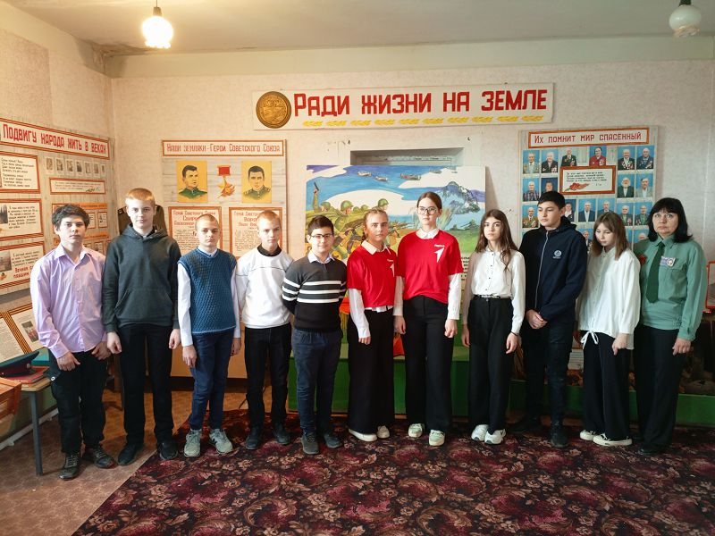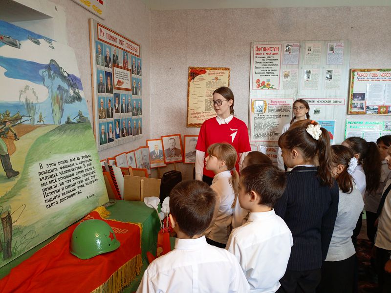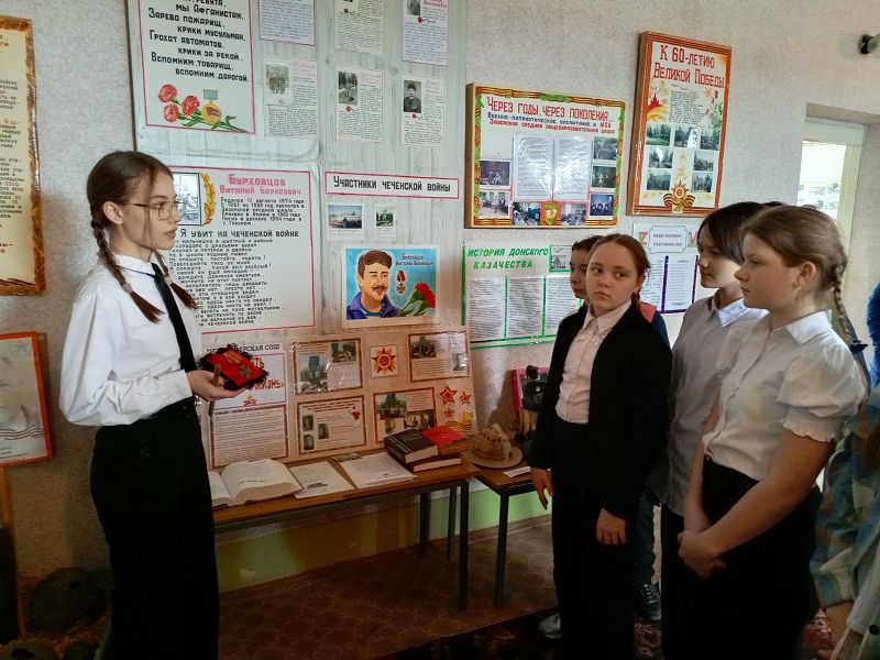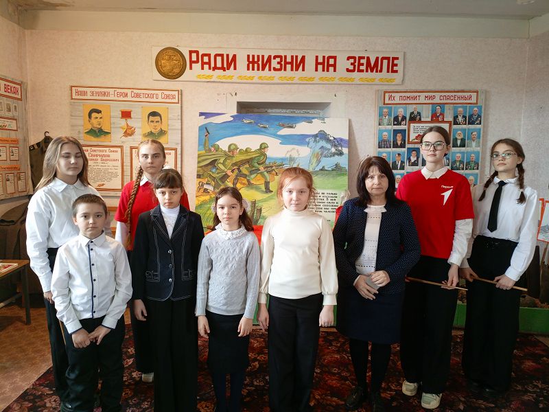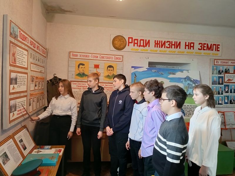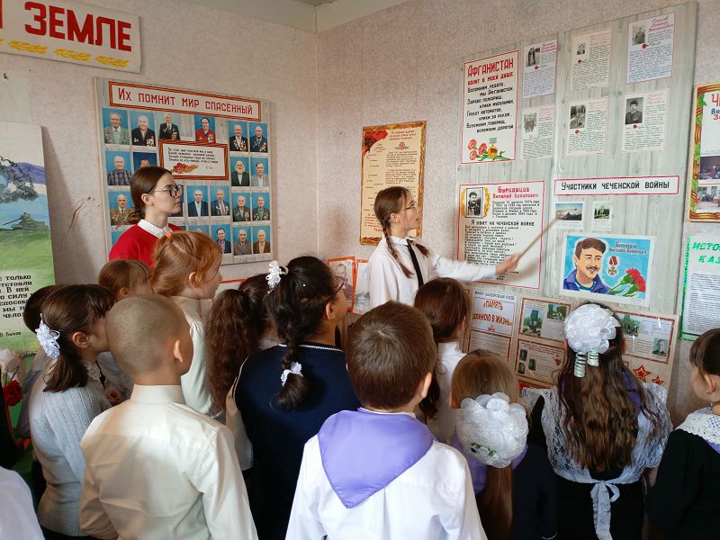 Экскурсоводы - активисты «Движения первых» Казьменко Анна ученица 10 класса, Клименова Елена ученица 9 класса, Иванчина Варвара, Лебедева Елизавета, Банько Вероника ученицы 8 класса под руководством советника директора по воспитанию и взаимодействию с детскими общественными объединениями, руководителя музея Самсоновой Н.А. познакомили школьников с подвигами защитников Отечества нашего родного края: Героями Советского Союза Свиридове А.А. и Воронине И.Н., ветеранами Великой Отечественной войны, Афганской и Чеченской войн и участниками СВО. Ребята почтили минутой молчания воинов, погибших за Родину.