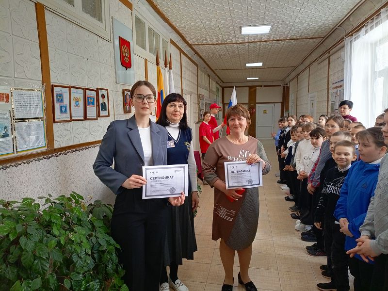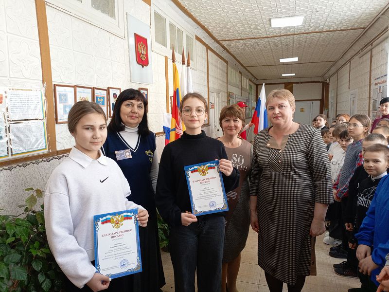 4 марта 2024 г. проведена традиция выноса Государственного флага РФ под исполнение Гимна России. На линейке были вручены благодарственные письма за участие в районном Дне науки Иванчиной Варваре и Лебедевой Елизавете ученицам 8 класса с учителем истории Высочевой Л.Е. и сертификаты за участие в региональной акции «Наши семейные книги памяти» Казьменко Анне ученице 10 класса и учителю Мышанской С.В. .