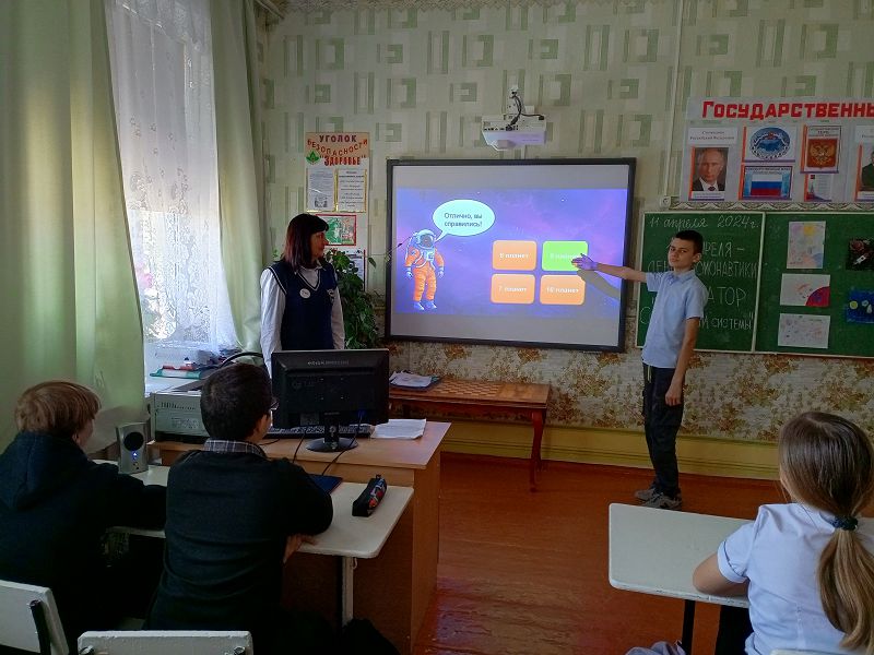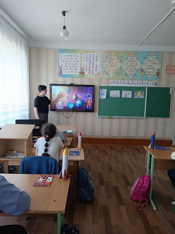 В преддверии Дня космонавтики в нашей школе под руководством советника директора по воспитанию и взаимодействию с детскими общественными объединениями Самсоновой Н.А., классными руководителями 1-11 классов и активистами первичного отделения «Движения Первых», проведены ряд тематических мероприятий: киносеанс «Космос, как Мечта», виртуальные экскурсии по музеям, посвященным истории развития авиации и космонавтики, мероприятие «Навигатор Солнечной системы», на котором ребята в интерактивной форме познакомились с планетами Солнечной системы; видеоквиз с участием С.Н.Рязанского, иммерсивный аудиоспектакль «Мечтая о звездах» и акция «Гагаринский старт». Дети обсуждали, какая планета более похожа на Землю, какая из них самая большая или маленькая, а где холоднее всего.