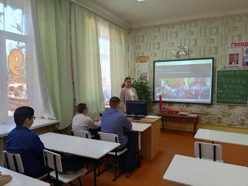 В этот день занятие «Разговоры о важном» проведены были на тему «Будь готов! Ко дню детских общественных организаций». Во время занятий учащимся 1-11 классов рассказали об истории пионерии в СССР и о деятельности современных общественных объединений для детей и молодежи. Обучающиеся узнали, как советский праздник День пионерии стал современным Днем детских общественных организаций. Помимо этого, с ребятами обсудили значение пионерского девиза «Будь готов! Всегда готов!» и его актуальность для нынешних поколений. Вели беседу о деятельности современных общественных объединений для детей и молодежи, таких как «Движение первых». В 2022 году в нашей стране было создано Российское движение детей и молодёжи — «Движение Первых», которое объединило и сплотило вокруг себя более 6 миллионов детей и молодёжи в возрасте от 6 до 25 лет с активной гражданской позицией и желанием менять мир к лучшему. С ребятами также обсудили способы активного и полезного времяпровождения во время летних каникул. Занятия прошли в формате познавательной беседы. Для вовлечения учащихся в обсуждение были использованы видеоматериалы, презентации и командные игры. Учащимся представили летнюю афишу событий, подготовленных «Движением первых». В некоторых классах педагоги дополнительно рассказали о походной программе этого общественного движения. В завершении занятия ребята сделали вывод о том, что Движение Первых объединяет активных, целеустремленных ребят и помогает им в раскрытии своих возможностей на благо развития страны. Проекты Движения Первых не только способствуют проявлению инициативы и самостоятельности, но и воспитывают ответственность и вовлеченность в коллективную деятельность для решения общественно-полезных задач.