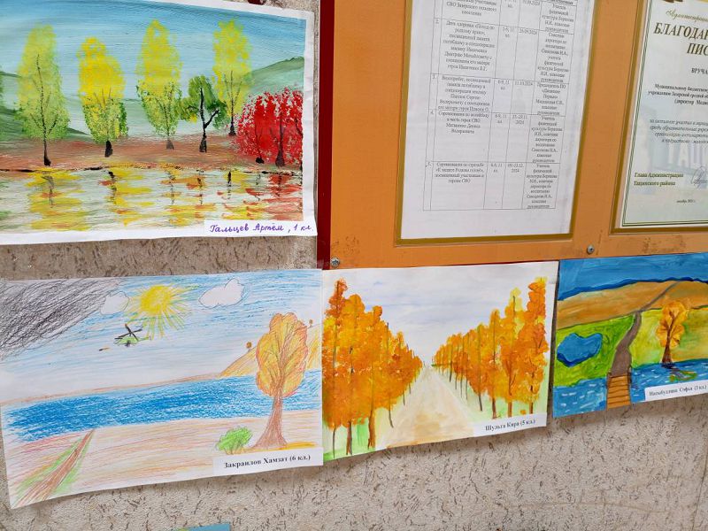 Все классы будут награждены грамотами. В личном первенстве среди обучающихся 1 место присуждено: Сараевой Д., Белыч М. (1 кл.), Шептухиной А. (2 кл.), Панченко Д. (3 кл.), Исаевой А. (6 кл.), 2 место: Текучевой Л. (2 кл.), Гальцеву А. (1 кл.), 3 место: Абубакаровой З. (1 кл.), Бережной П. (1 кл.), Пуш К. (5 кл.). Лучшие работы обучающихся: Сараевой Д. (1 кл.), Шептухиной А. (2 кл.), Панченко Д. (3 кл.) и Исаевой А. (6 кл.) приняли участие в районном конкурсе "Мастерами славится Россия". В конкурсе рисунков «Золотая осень родного края» победителями стали среди 1-6 классов Гальцев А. (1 кл.), Бережная П. (1 кл.), Шульга К. (5 кл.), 2 место заняли Пуш В. (3 кл.), Закраилов Х. (6 кл.), Насыбуллина С. (3 кл.), 3 место Текучев В. и Шишова Е. (3 кл.). Желаем дальнейших успехов в творчестве нашим детям!