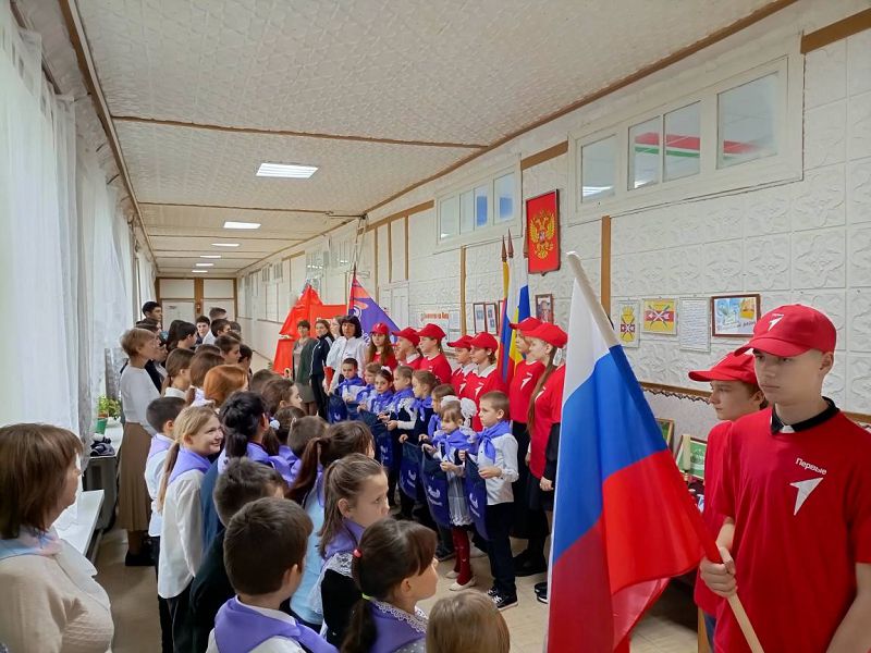 Посвящение первоклассников в "Орлята России" состоялось 8 ноября 2024 года на торжественной общешкольной линейке в МБОУ Зазерской СОШ. Мероприятие было начато с выноса Государственного флага России и флага "Движение первых" под исполнение гимна России.