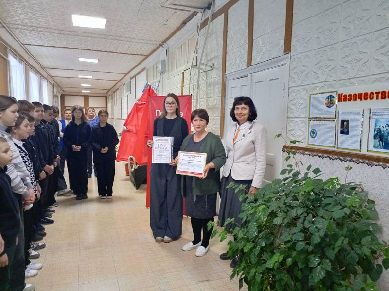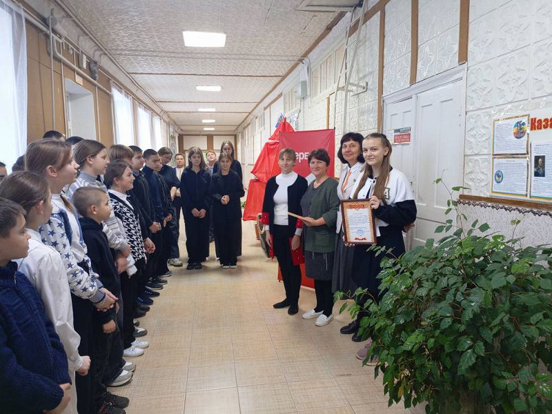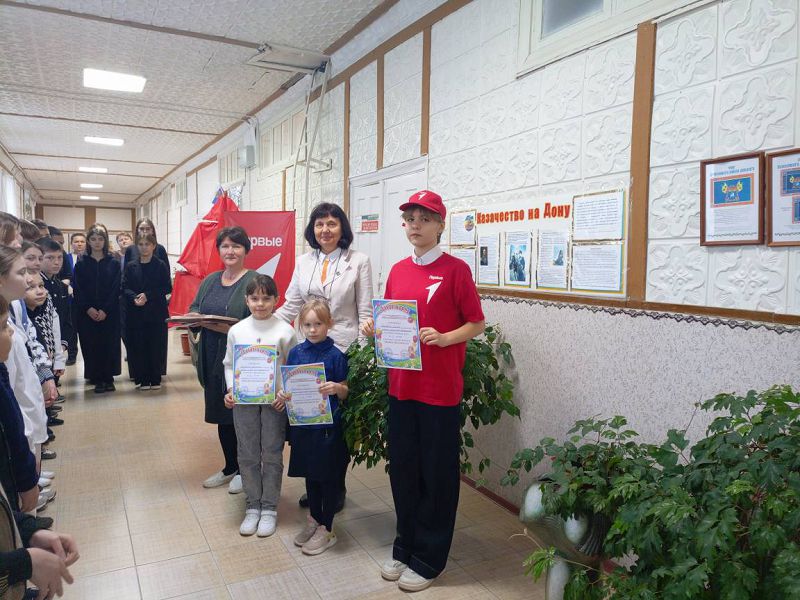 На линейке советником директора по воспитанию Самсоновой Н.А. были награждены грамотами и дипломами за победу в районных конкурсах: декоративно-прикладного творчества "Мастерами славится Россия": Сараева Дарья ученица 1 класса (1 место), Шептухина Анастасия ученица 2 класса (3 место), Панченко Дарина ученица 3 класса (1 место), Исаева Ариана ученица 6 класса (1 место); в районном конкурсе рисунков "Творчество для всех": Бережная Полина ученица 1 класса (1 место), Шептухина Анастасия ученица 2 класса (2 место), Пушкарева Ульяна ученица 6 класса (1 место). Вручены благодарности за оказание гуманитарной помощи и моральной поддержки раненым бойцам СВО Исаевой Ариане ученице 6 класса и учителю русского языка и литературы Исаевой И.В.; Благодарственное письмо за участие в Региональной Премии "Первый на Дону" председателю ПО "Движение Первых" Мышанской С.В.; сертификат участника Регионального конкурса видеороликов "Эколята - молодые защитники природы" Казьменко Анне ученице 11 класса.