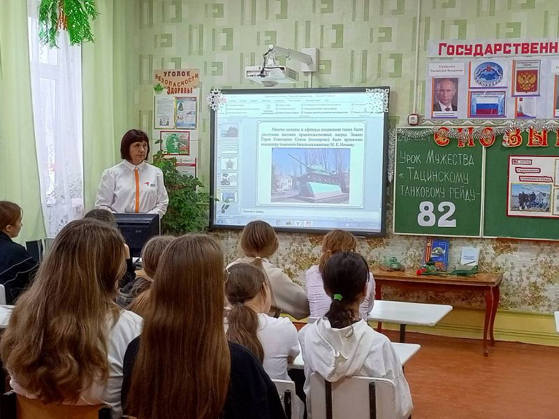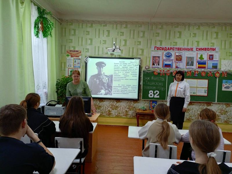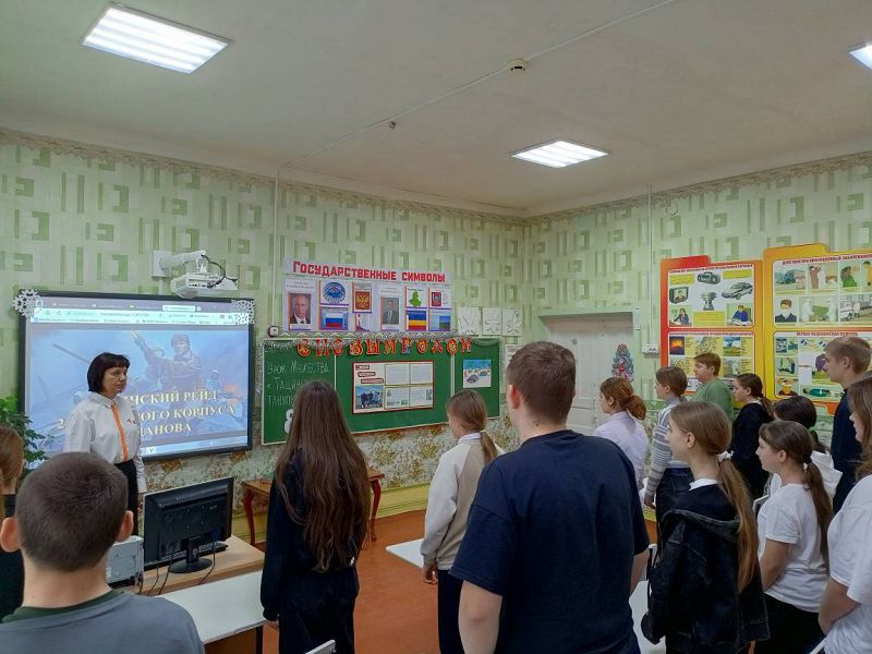 Учитель истории Высочева Л. Е. рассказала о значении рейда 24-го танкового корпуса под командованием генерала-майора В.М. Баданова в разгроме фашистов под Сталинградом 2 февраля 1943 года и коренном переломе в ходе Великой Отечественной войны с просмотром документального фильма. Ребята познакомились с подвигами Михаила Нечаева и юных тацинцев Гриши Волкова и Феди Игнатенко. В завершении урока прозвучало стихотворение тацинского поэта Гречкина Дмитрия Федоровича "Памяти Героев", посвященное Героям тацинского танкового рейда. Минутой молчания дети и педагоги почтили память Героев танкистов. Вечная им Слава!