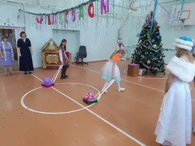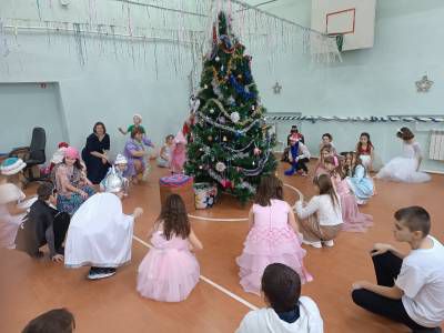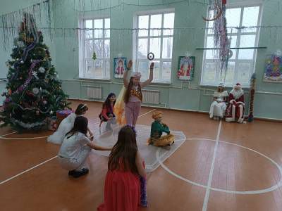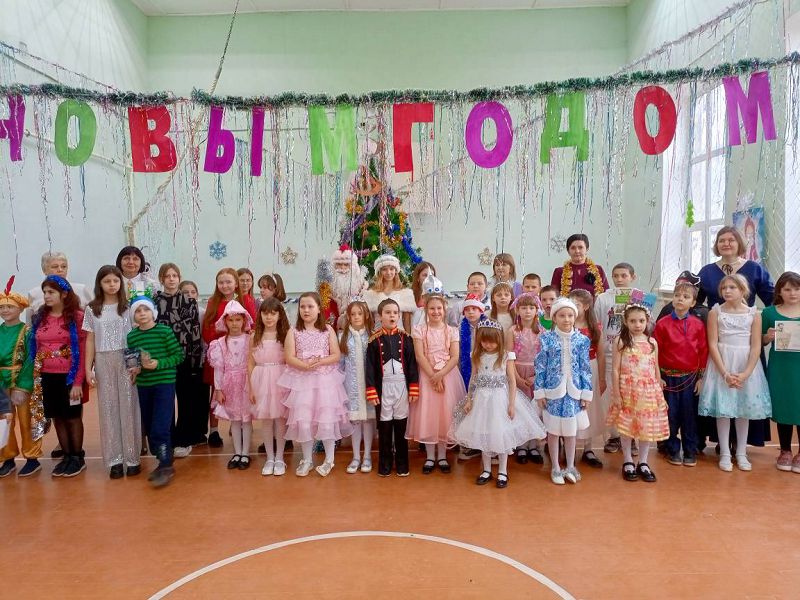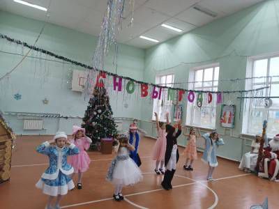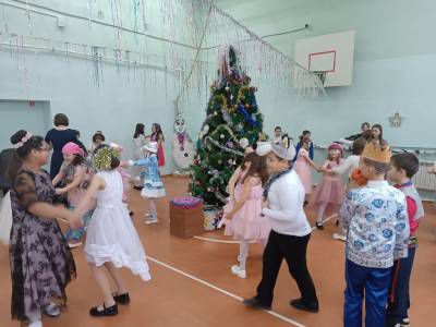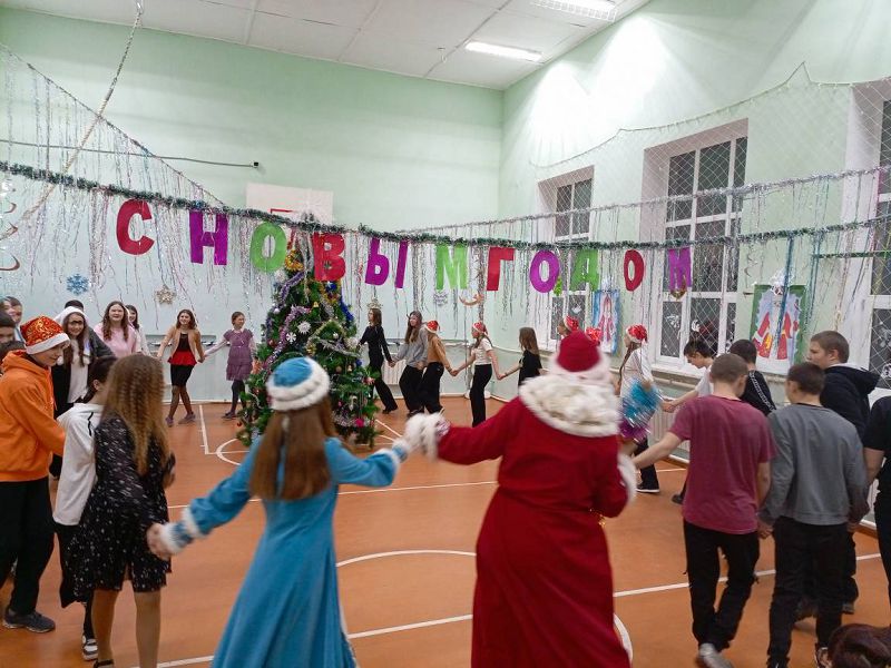 Новогодний утренник для 1-5 классов и Новогодний бал для обучающихся 6-9, 11 классов. Праздники начинались по традиции с хоровода вокруг елочки с Дедом Морозом и Снегурочкой.