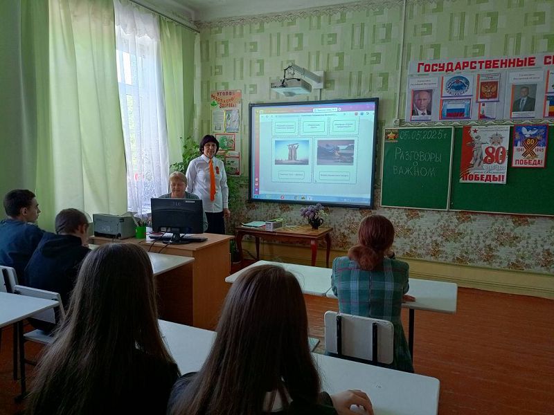 На занятиях с обучающимися 1-9, 11 классов обсуждалось всемирно-историческое значение этого события и та решающая роль, которую сыграл Советский Союз в победе над фашизмом. 9 мая для каждого россиянина – не просто праздничный день, это священная дата памяти о беспримерном героизме многонационального советского народа, ковавшего Победу на фронтах и в тылу. Для каждого из нас жизненно важно сохранить в сердце понимание ценности мира, единство и несокрушимую силу духа, завещанные нам предками. Мы обязаны передать будущим поколениям священную память о Великой Победе – о доблести Красной Армии, о трудовом подвиге в тылу.