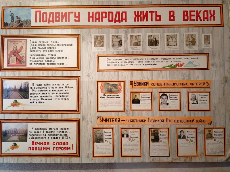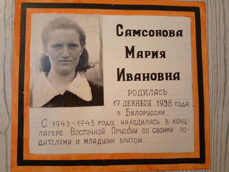 Наша память о Героях нашей Родины жива! В акции "Нельзя забыть", посвященной Международному дню памяти жертв фашизма, приняли участие советник директора по воспитанию и взаимодействию с детскими общественными объединениями Самсонова Н.А. совместно с обучающимися МБОУ Зазерской СОШ. В рамках мероприятия они посетили школьный музей, где на стенде "Подвигу народа жить в веках" познакомились с информацией об узниках концлагерей времен Великой Отечественной войны, жителях Зазерского сельского поселения. Среди них родственница советника - Самсонова Мария Ивановна 1938 года рождения, которой выпала доля с родителями и братом стать узниками концлагеря в Восточной Пруссии из Белоруссии. Около трех лет с 1943 по 1945 годы родители трудились на предприятии по изготовлению парашютов. Из воспоминаний Марии Ивановны семья пережила гибель близнецов-младенцев, рожденных в концлагере, питание помоями и продуктами, которые кидали через забор неравнодушные немцы, а также ее маленький геройский поступок - обмотанной парашютной тканью под верхней одеждой, она прошла через пропускной пункт не замеченной. Ткань пошла для пошива нижнего белья детям лагеря.