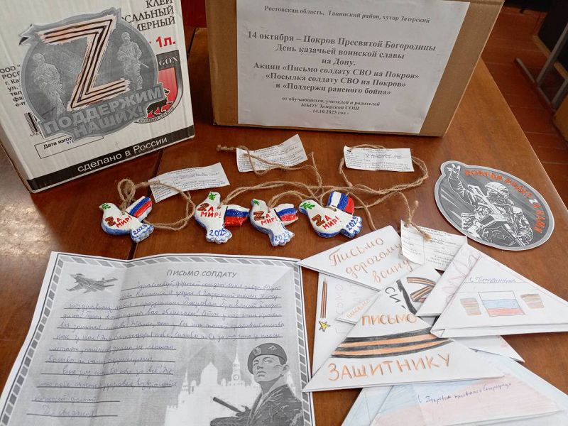 16 октября 2025 года в МБОУ Зазерской СОШ были отправлены посылки, талисманы-Мира и письма солдатам СВО к Покрову, подготовленные обучающимися, родителями и педагогами, на пункт сбора гуманитарной помощи партии "Единая Россия" в ст. Тацинскую.