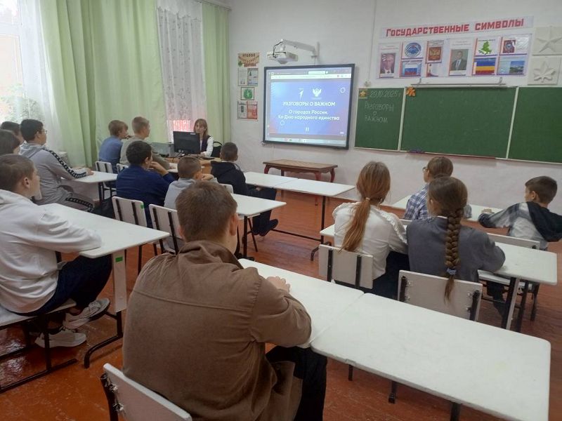 Затем в 1-10 классах проведены были очередные занятия «Разговоры о важном» на тему: «О городах России. Ко Дню народного единства». День народного единства — государственный праздник, связанный с историческими событиями и напоминающий нам, что сила России в единстве. Города России — это воплощение этнокультурного многообразия и многонационального единства нашей страны, неразрывной связи прошлого, настоящего и будущего.