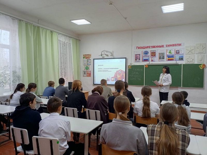 Советником директора по воспитанию и взаимодействию с детскими общественными объединениями Самсоновой Н.А. организована лекция "Сила - в многообразии: язык и традиции разных народов России" совместно с "Российским обществом "Знание" и проведена в формате классного часа с обучающимися 5-9 классов. В ходе мероприятий дети познакомились с историей возникновения праздника, подвигами наших предков во имя независимости Родины. Ребята вспомнили о том, как велика и красива наша Родина, как богата событиями её история, закрепили свои знания о государственных символах, а также познакомились с культурой и традициями некоторых народов нашей страны.