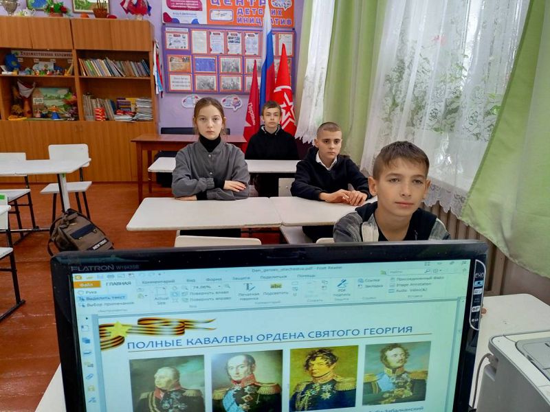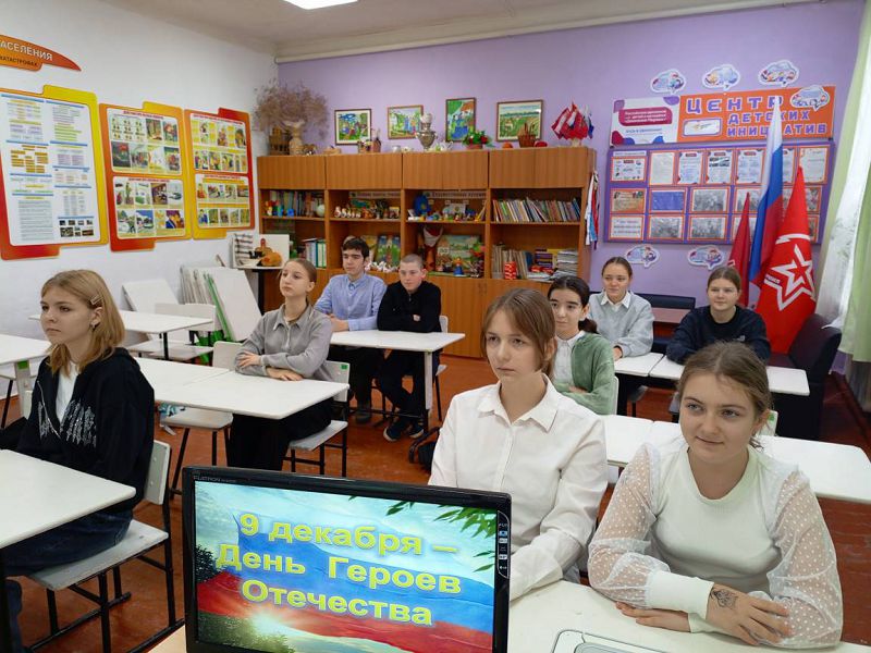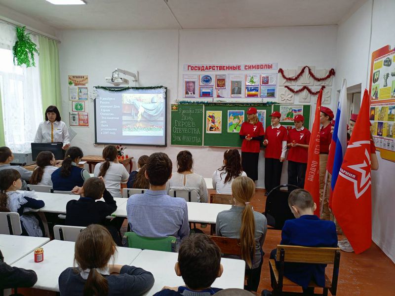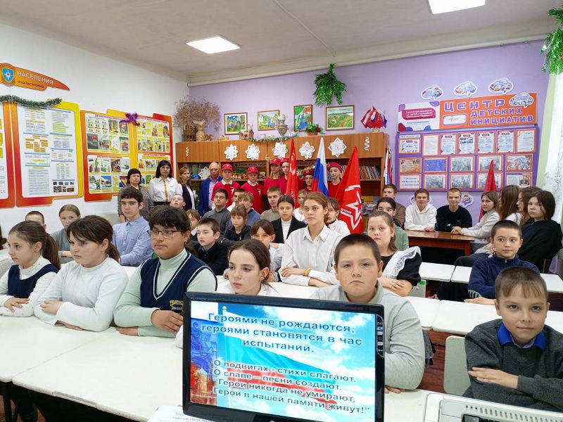 Общешкольная линейка и Урок Мужества "Мы гордится Героями должны..." проведены с обучающимися школы с приглашением Главы Администрации Зазерского сельского поселения Тищенко А.С.. Минутой молчания почтили минутой молчания всех Героев Отечества дети и взрослые. Обсуждение смысла понятия "героизм" и его значении в жизни нашего общества было продолжено на Уроке Мужества с просмотром презентации о Героях Отечества с истории основания Российского государства. Активисты школы подготовили доклады о Героях родного края, которые отдали свои жизни за Родину: Герое Советского Союза Воронине И.Н., чье имя носит наша школа, Герое Чеченской войны Бурховцове В.Б., Героям СВО Иванченко Д.М., Плисюк С.В., Кожанове С.А. и Лещенском С.И.. Низкий им поклон и вечная память!