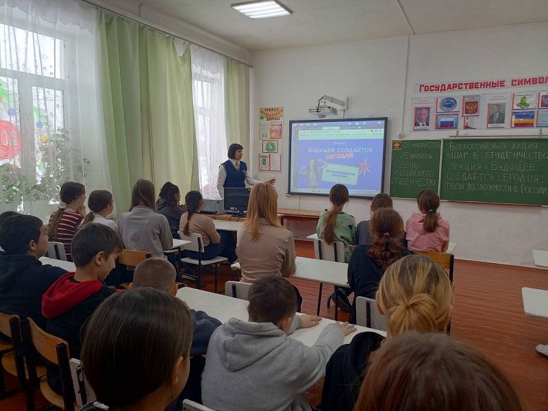 Затем с обучающимися проведена лекция "Будущее создается сегодня: твои возможности в России" в формате классного часа совместно с "Российским обществом "Знание". В ходе просмотра презентации ребята познакомились с возможностями, которые предлагают разные платформы в нашей стране, для
