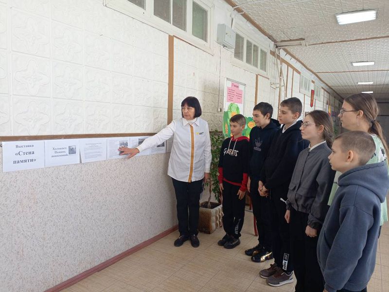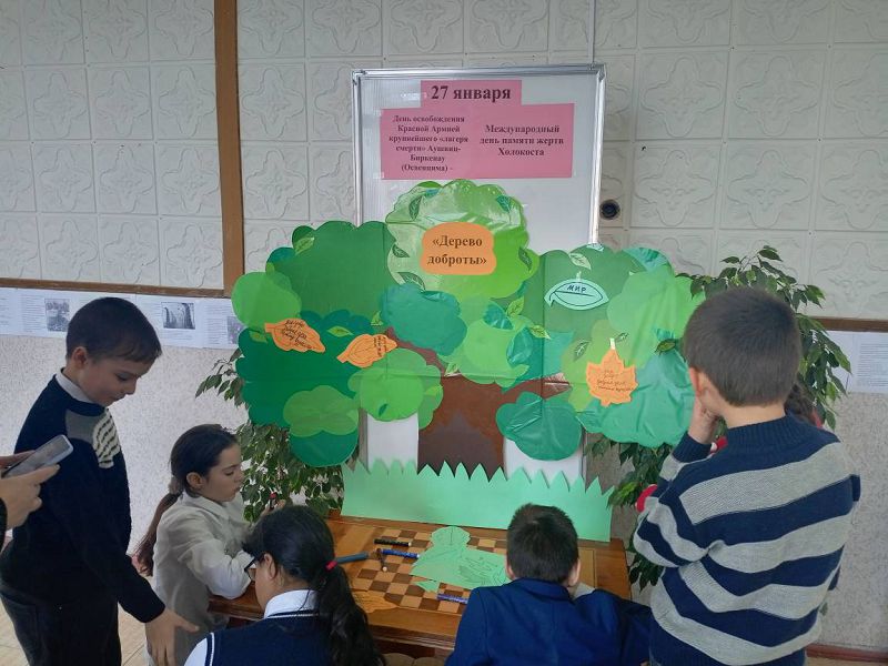 На листочках дети написали пожелания мира и добра, прикрепив их к дереву, а после обсудили тему "Как мы можем делать мир добрее? Также оформлена выставка-инсталляция "Стена памяти", которая призвана способствовать осознанию школьниками трагедии Холокоста через личное взаимодействие с историческими материалами, пониманию человеческой жизни, формирования уважительного отношения к памяти жертв от фашизма. Ребята почтили память минутой молчания погибших евреев и людей других национальностей на долю которых выпала такая страшная судьба.