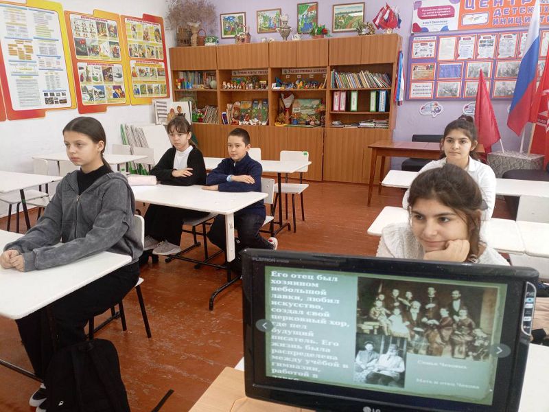 В рамках мероприятий ко Дню рождения писателя учащиеся совершили видеоэкскурсию «Путешествие по местам Чехова». Дети виртуально побывали в исторических уголках города Таганрога, где прошли детские и молодые годы писателя, увидели памятные дома и музеи, связанные с его жизнью. Литературная гостиная "Чеховские страницы" познакомила школьников с годами жизни и творчества великого писателя, сделала обзор его величайших произведений, вошедших в золотой фонд мировой литературы, с такими как: "Толстый и тонкий", "Дядя Ваня", "Чайка", "Вишневый сад", "Три сестры" и др.. «Мир Чехова» — это мир искренности, тонкого юмора и глубокого сострадания к человеку. Интеллектуальная игра-викторина «Рассказы великого мастера»