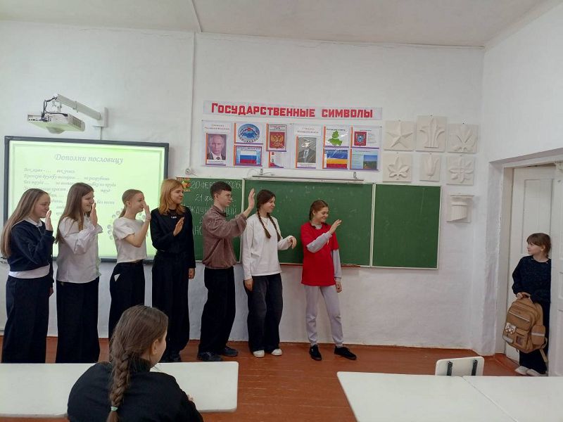 После просмотра презентации по истории праздника активом обучающихся проведена игра-пантомима "Ожившие пословицы" с обучающимися начальных классов. Задача игроков - без единого слова, с помощью жестов и мимики, коллективно изобразить ее смысл так, чтобы другие смогли отгадать. С обучающимися 7-10 классов проведена настольная игра "Лингвистический шторм", в рамках которой участники в игровой форме смогли расширить знания о языке и устойчивых сочетаниях слов. Также обучающиеся и педагоги приняли участие в онлайн акции "Как говорится".