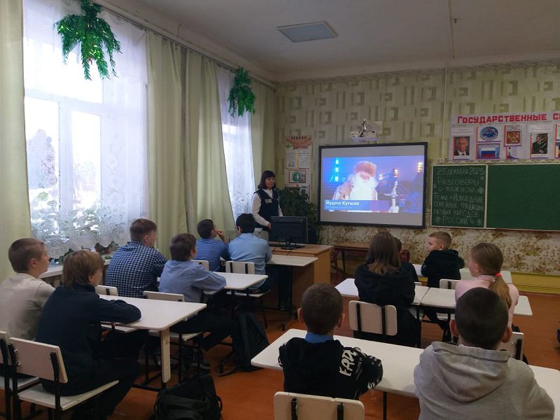 25 декабря 2023 г. школьная линейка в нашей школе была начата с выноса Флага России под исполнение Государственного гимна. Советник директора рассказала о теме занятий «Разговоры о важном», которая посвящена встрече Нового года, семейным традициям этого праздника в каждой семье, национальным традициям всех народов нашей страны, подведению итогов каждого из нас и итогов нашей страны.