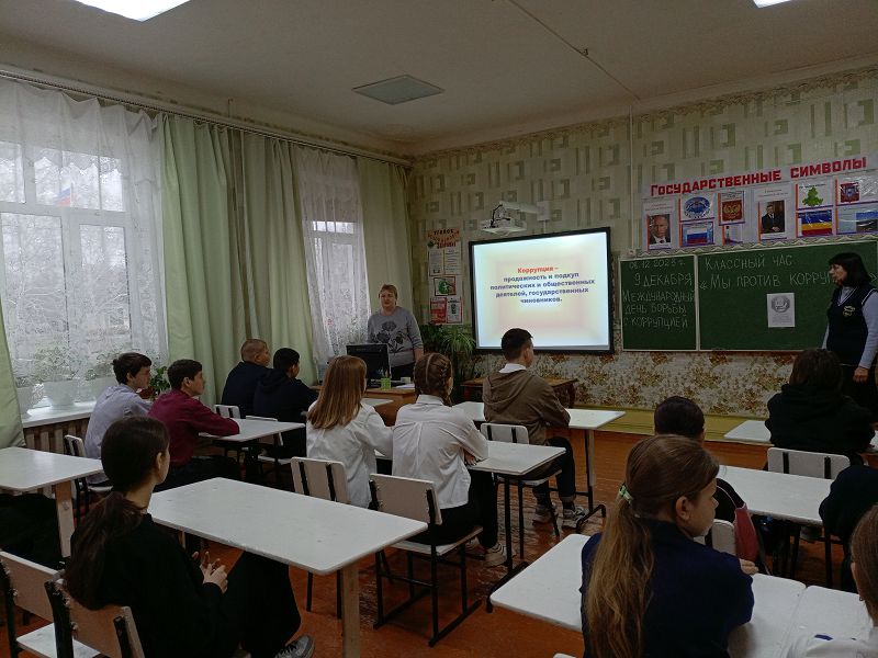 Ежегодно 9 декабря отмечается Международный день борьбы с коррупцией. В рамках этого дня в нашей школе с обучающимися 8-11 классов, 8 декабря 2023 г., проведен классный час на тему: «Мы против коррупции» учителем обществознания Высочевой Л.Е. совместно с советником директора по воспитанию Самсоновой Н.А.. Цель данного мероприятия: просвещение, пропаганда и формирование у обучающихся антикоррупционного мировоззрения.