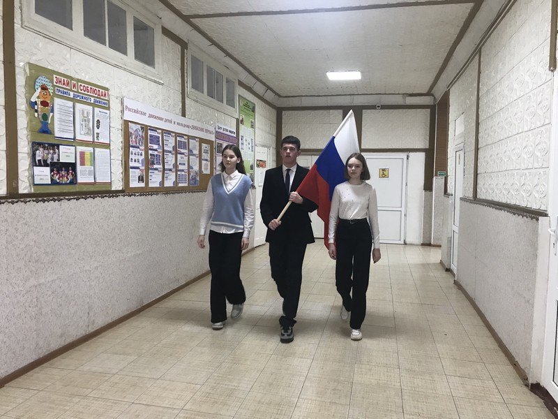 20 марта 2023 г. школьная линейка начата с выноса государственного флага под исполнение гимна РФ знаменной группой.